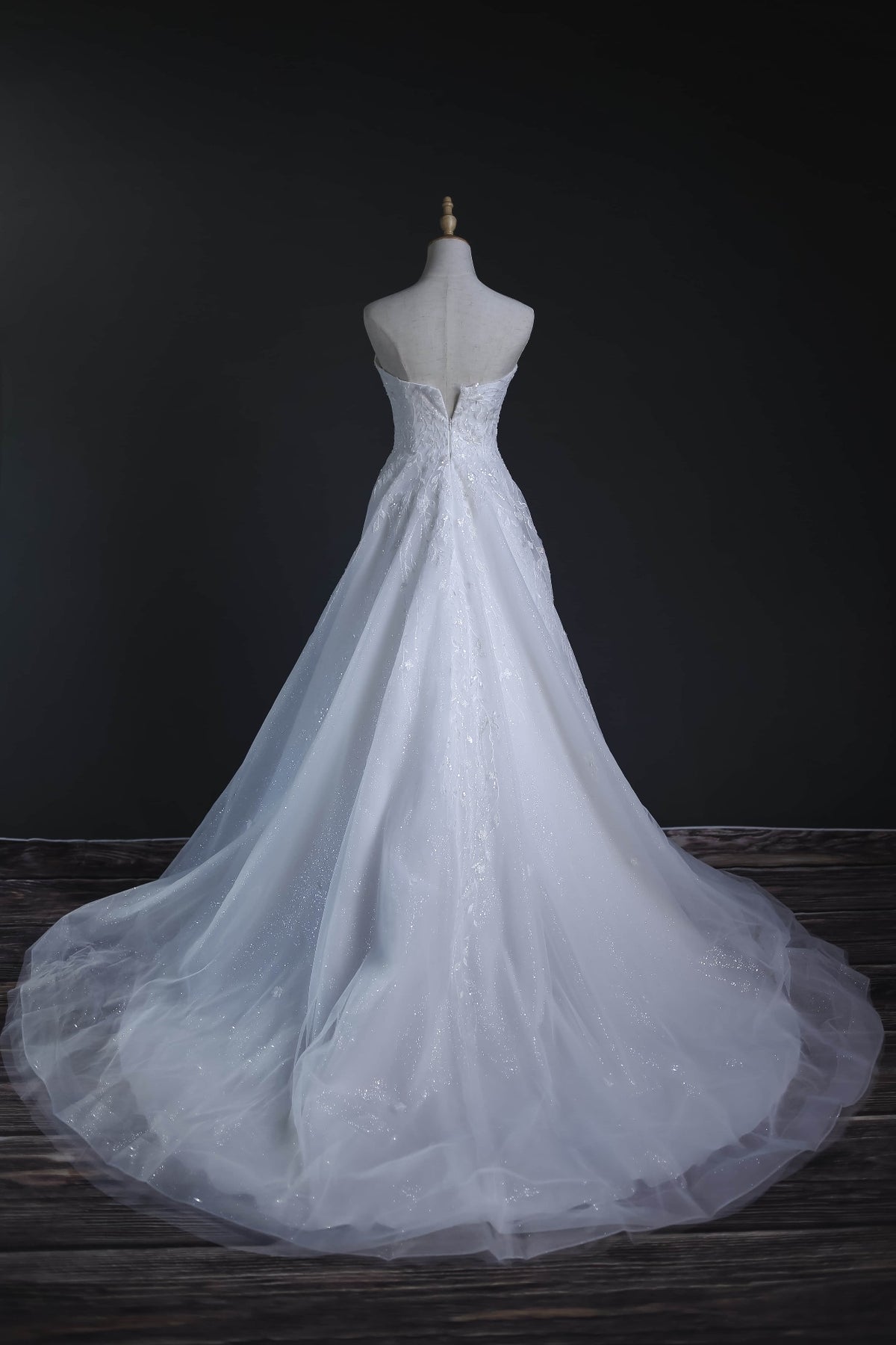 This gown features a sweetheart neckline and a floral lace applique top that seamlessly transitions into a skirt crafted from glitter tulle and organza. The V-back, adorned with floral embroidery, adds an elegant nuance. The back is neatly secured with a zipper and hooks