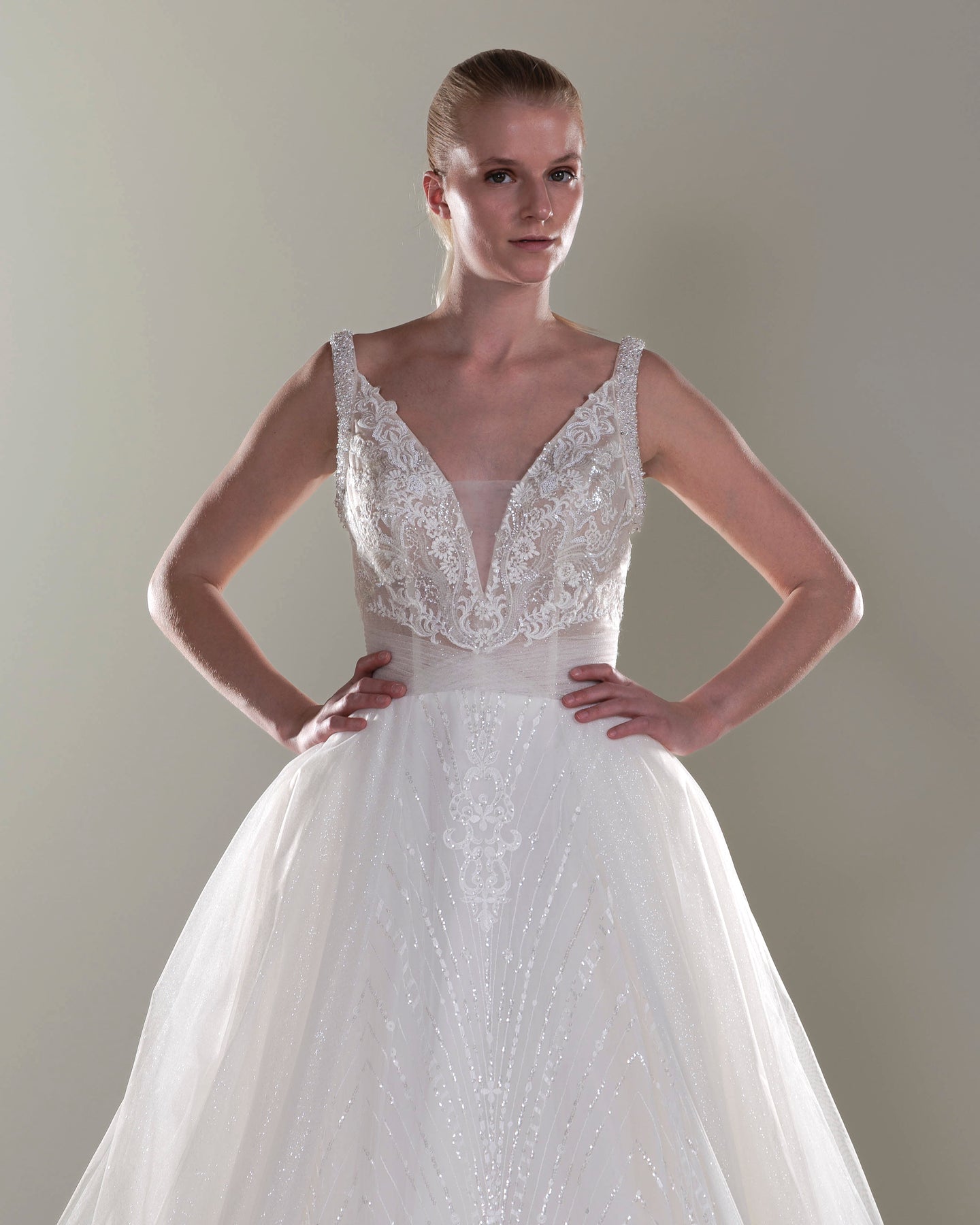 Boasting a V-neckline adorned with lace, the gown features a beaded floral lace top and straps. Glitter tulle forms the skirt, enriched by floral embroidery. A V-shaped back and a discreet zipper with hooks complete the design, offering a refined fusion of contemporary and classic elements.