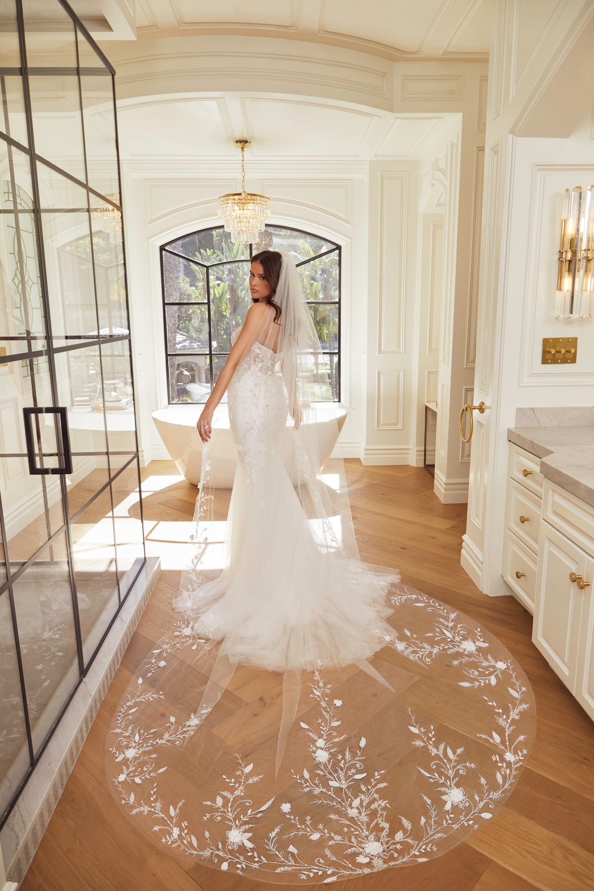 Lisette is a strapless fit-and-flare gown with floral lace, beading, and embroidery on tulle. The boned bodice offers support and a flattering shape, with an optional lining. Pair with the matching cathedral veil