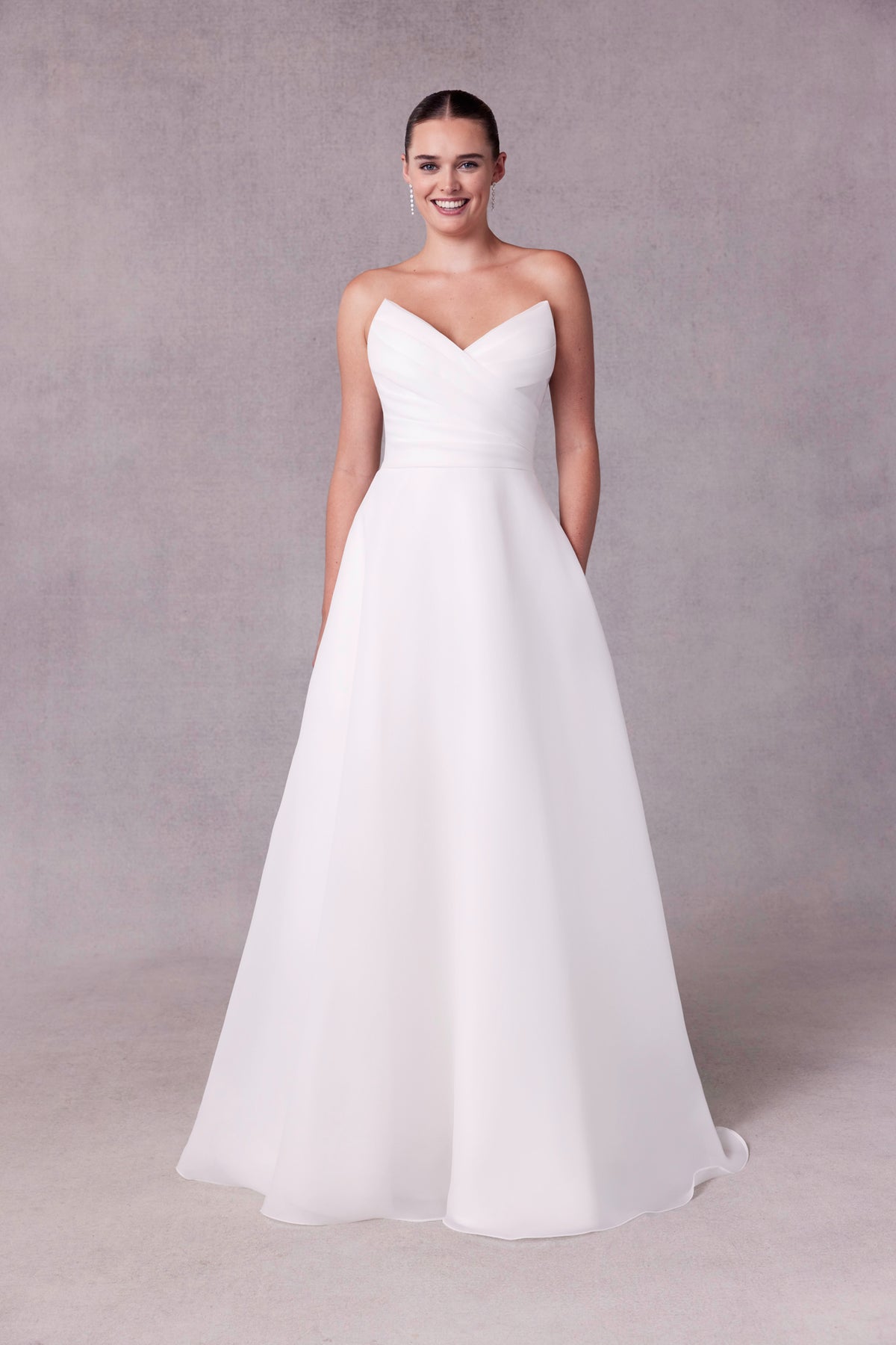 Simple silk organza wedding dress has an asymmetrically draped bodice with a strapless cat-eye neckline on an A-line skirt.