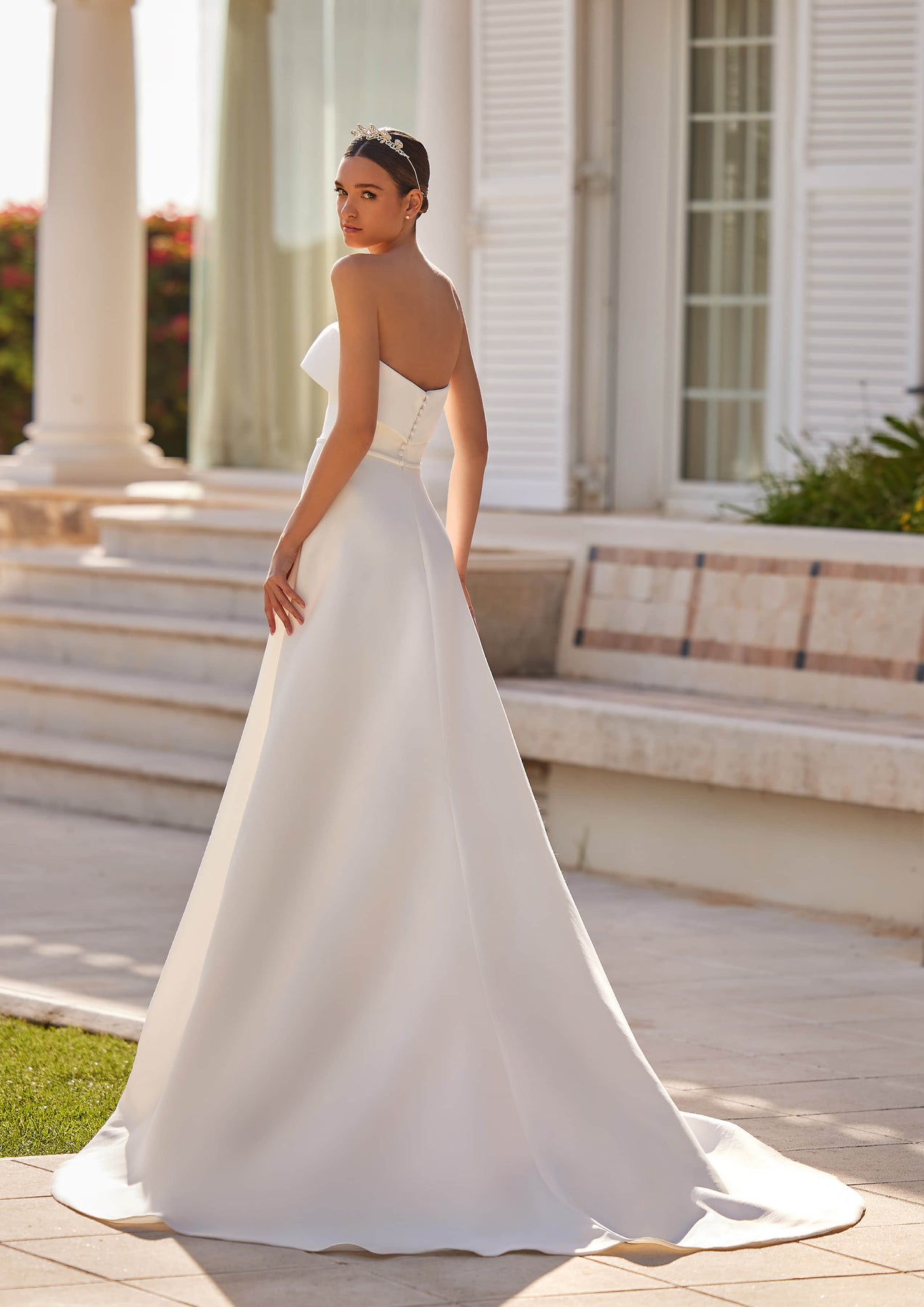 ELEONOR. This A-line Mikado wedding dress features a strapless, folded neckline, beautifully adorned with a single row of beads at the natural waist. The dress comes with a detachable train, offering both elegance and versatility