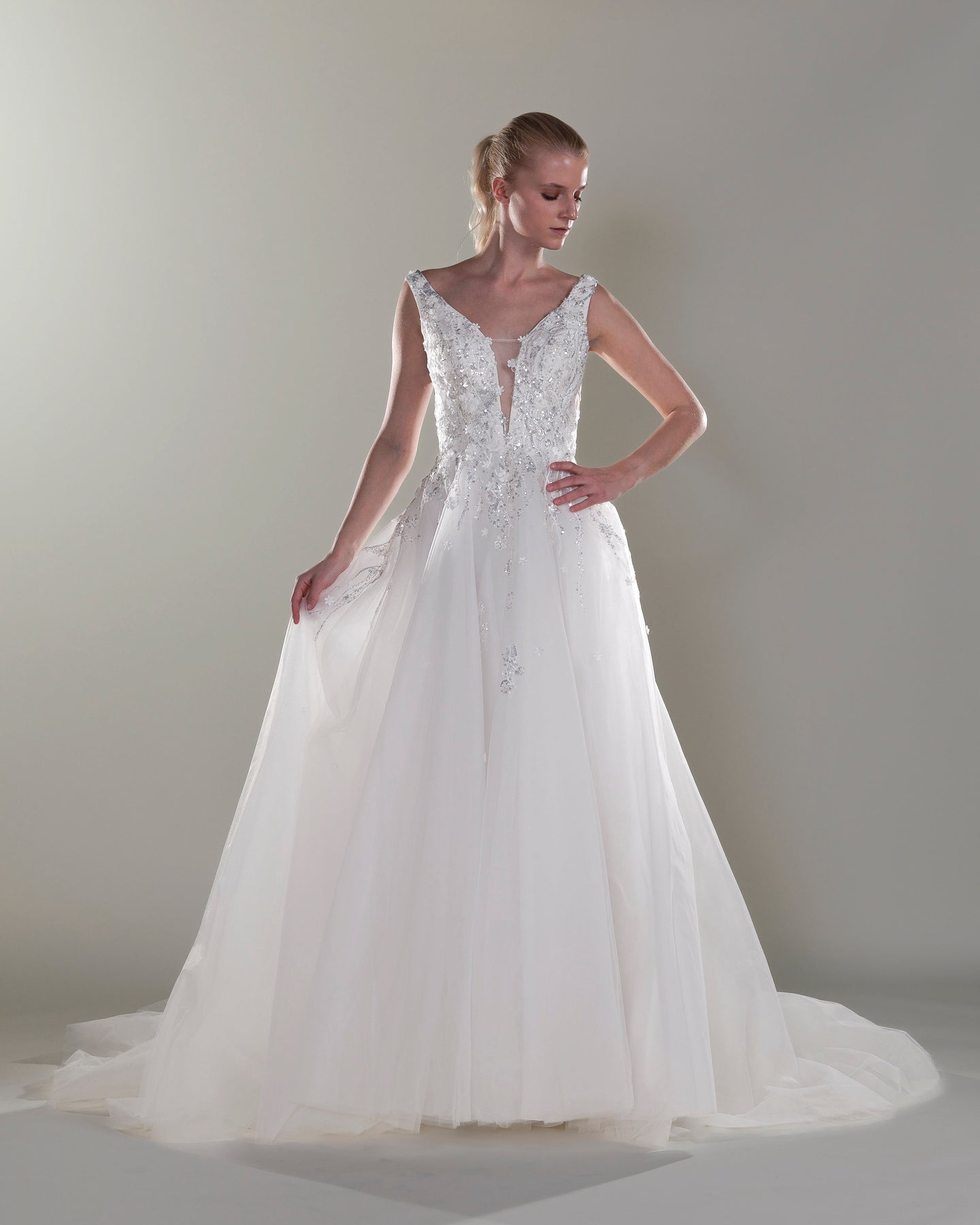 Tags: A-line       Ballgown       Bridal dress       Chapel train       Floral       Plunging v neckline       Sample dress available       Sample sale       Sequins       Sleeveless       Tulle       V-neckline       V-shaped back       Zipper and hooks       Zzb