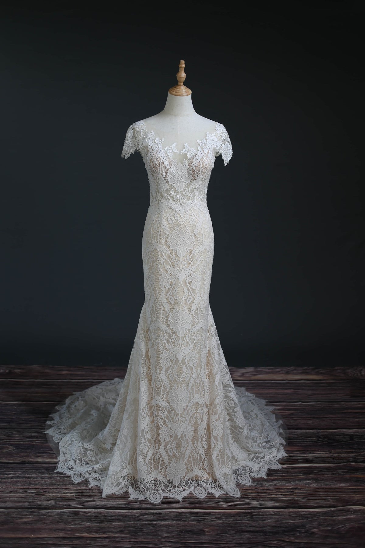 Grace the aisle in a gown that embodies refined beauty. This ensemble features a round neckline artistically enhanced by floral embroidery and beading. A V-shaped back adds a touch of allure, skillfully secured by a zipper and hooks. The chapel train elevates the overall elegance, making it a bridal masterpiece.