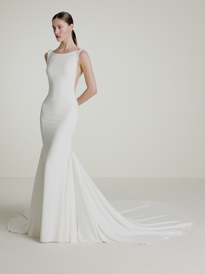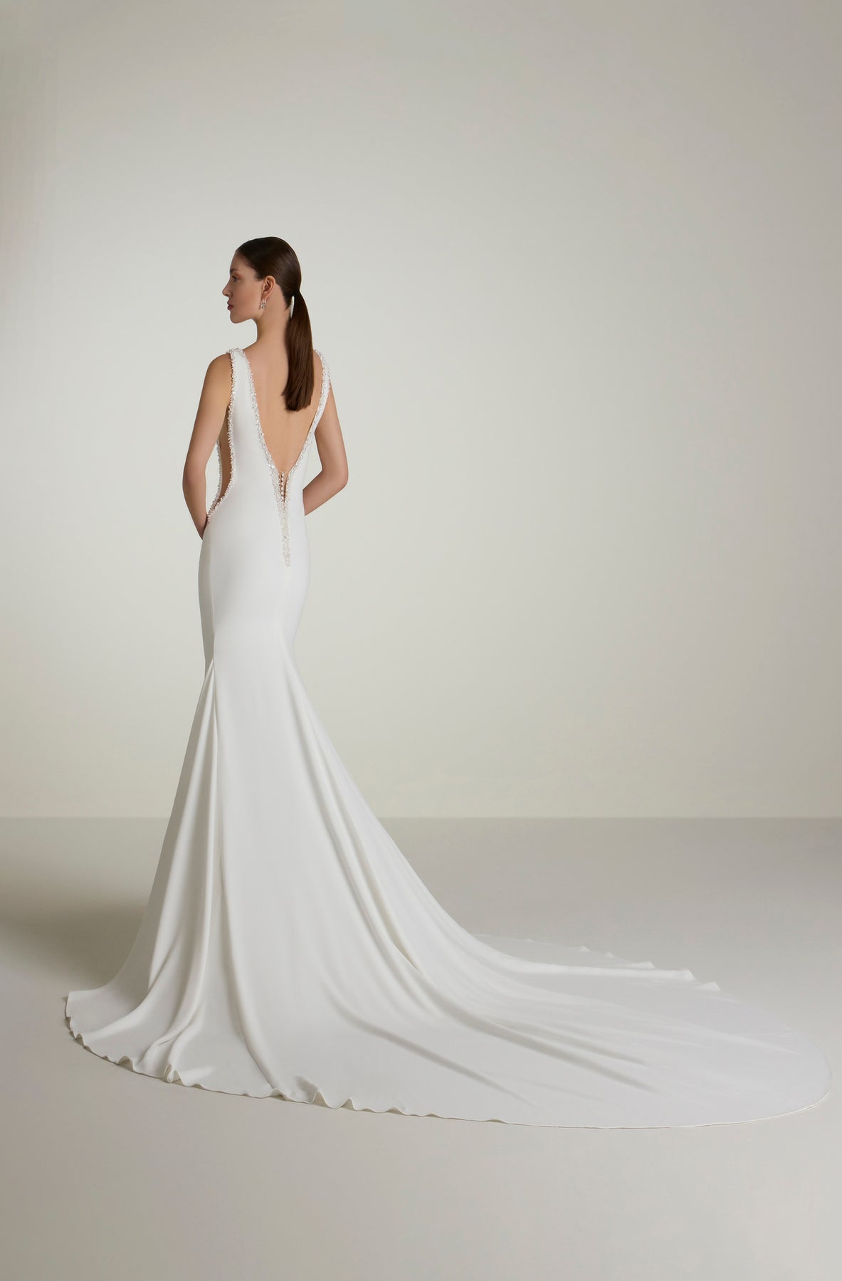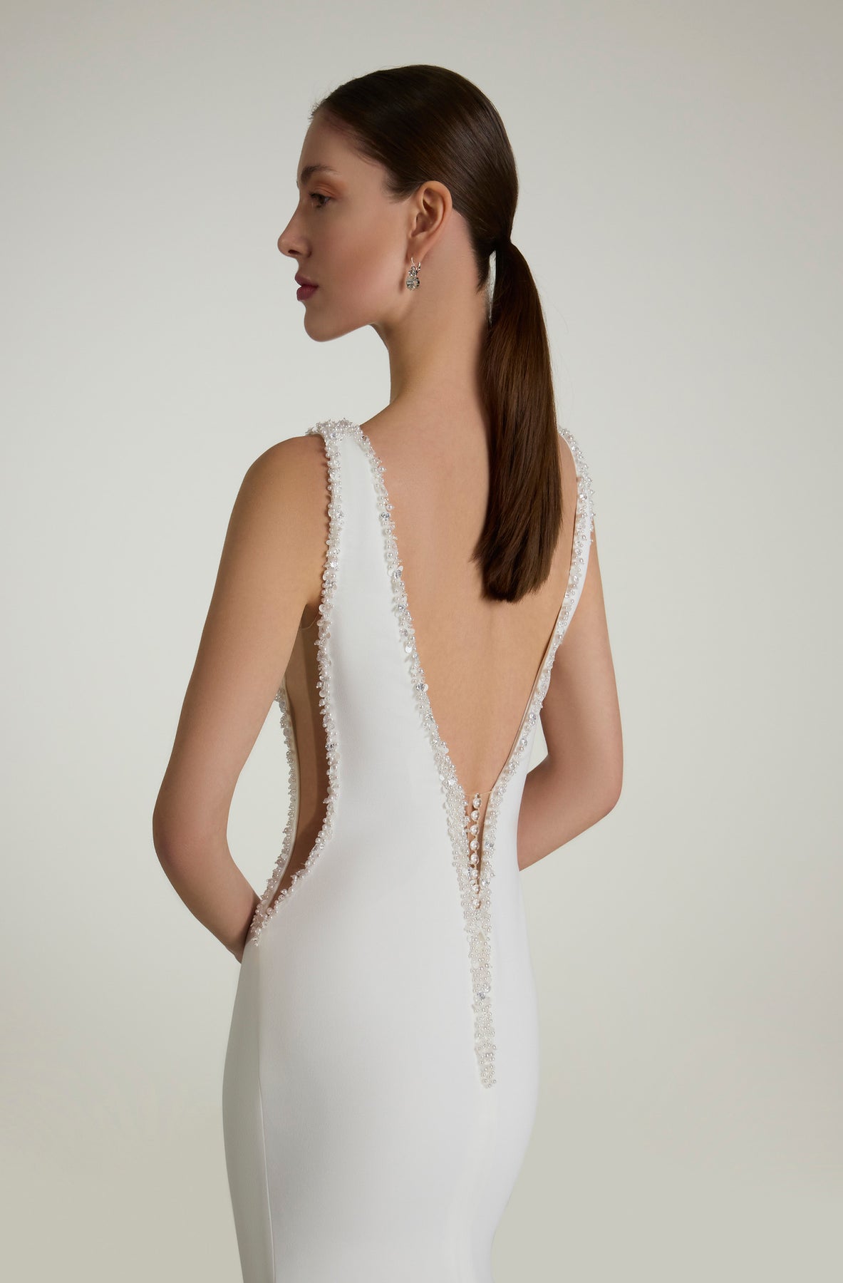 The ETERNO model, made of crepe, features an elegant mermaid silhouette with a bateau neckline and low V-back. The design highlights the delicate rhinestone details that frame the sides of the bodice and the wonderful flounce that the skirt acquires in the back at the knees and that leads to a long, sophisticated 250 cm train