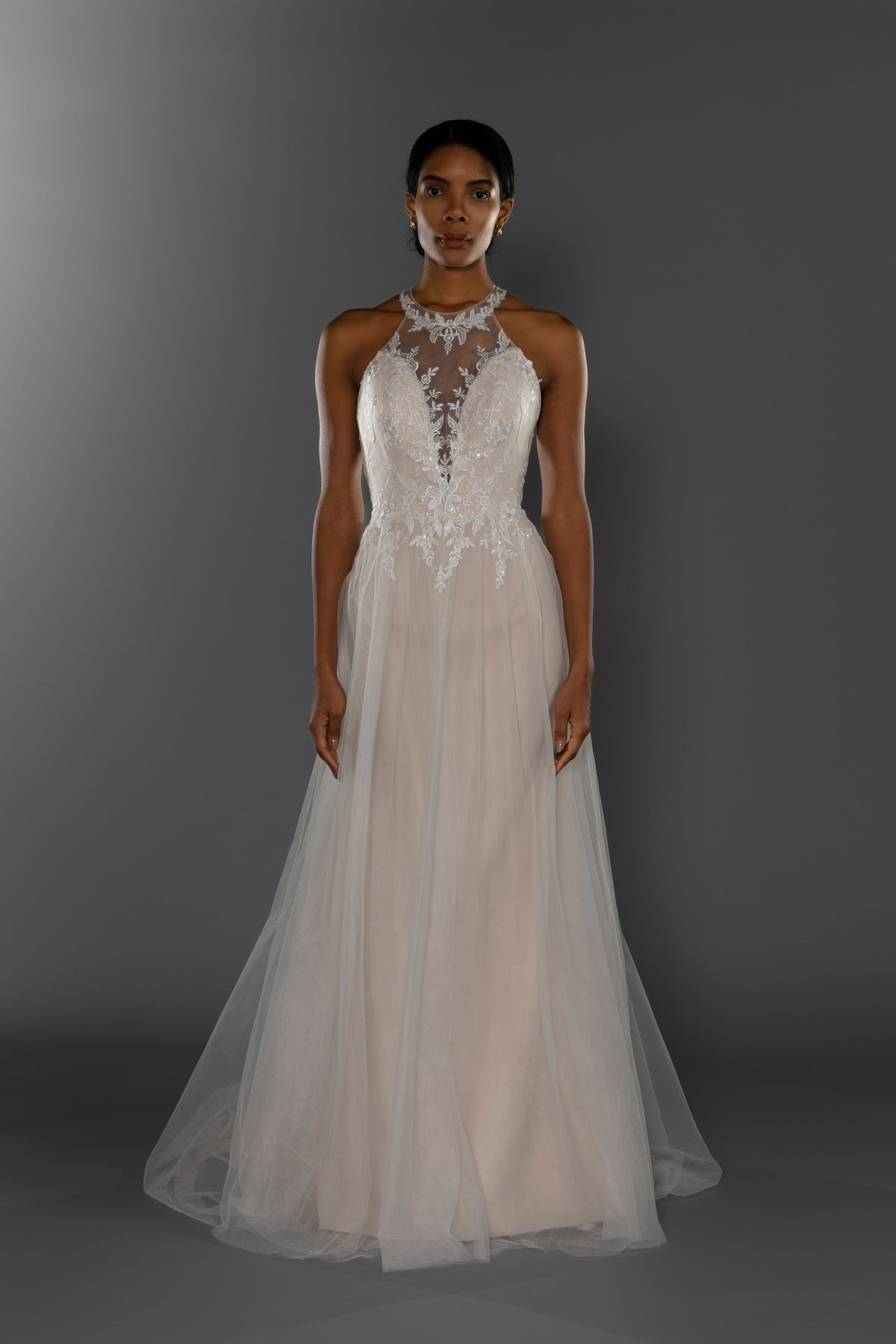 This A-Line gown features a round neckline and sleeveless design, crafted from premium tulle with floral embroidery. It includes a satin lining for comfort, and the back secures with a zipper and buttons. The gown flows into a court train, providing a graceful and elegant silhouette.