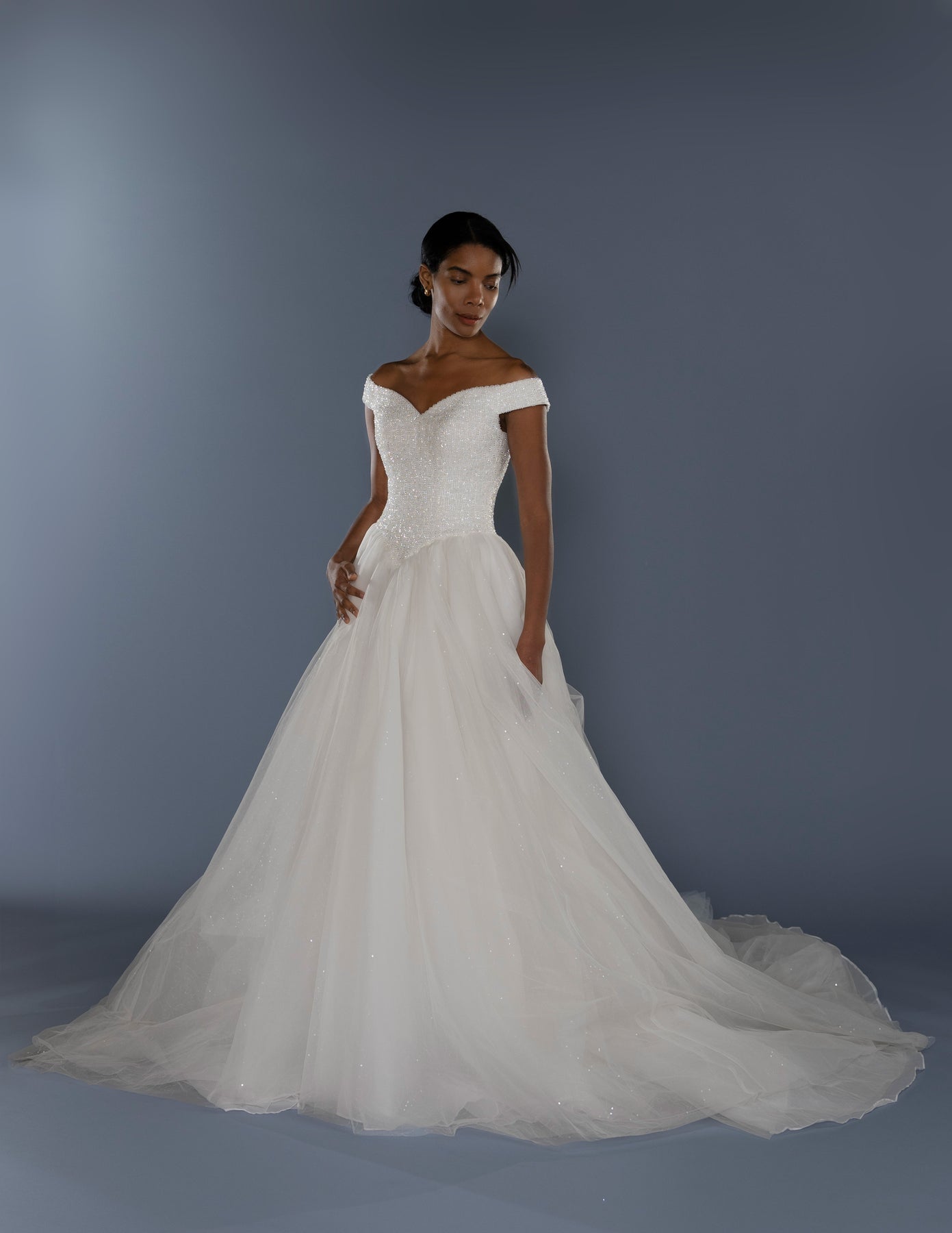 This A-Line Ballgown features an off-the-shoulder neckline, adding a touch of elegance and allure. It's crafted from glitter tulle embellished with intricate beading, creating a shimmering effect. The gown includes a smooth satin lining for comfort and extends into a chapel train for a dramatic, flowing appearance. A classic lace-up back ensures a perfect fit